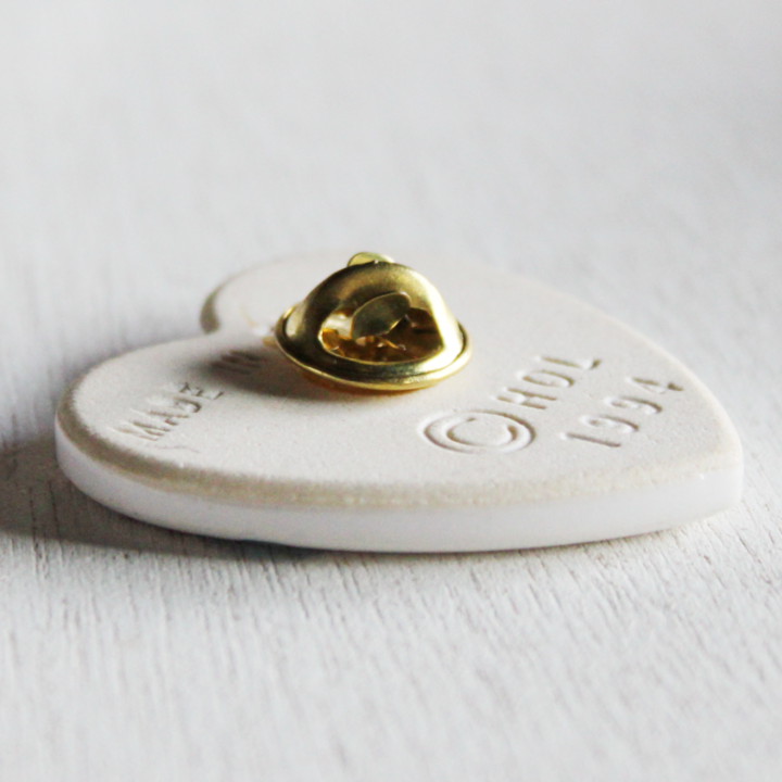 ピンバッジの表面は釉薬と絵柄のペイントが施してあり、裏面は陶器の素焼き部分が出ています。