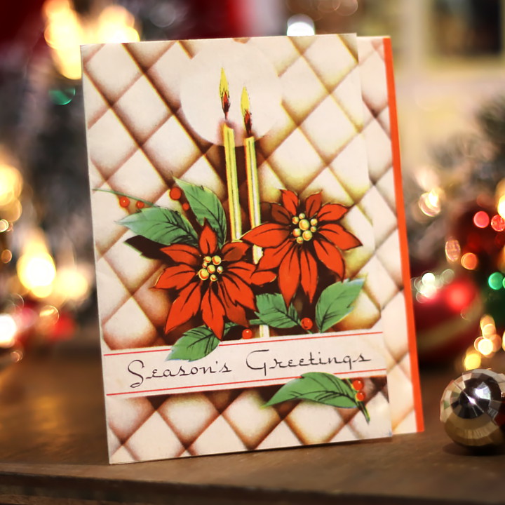 アンティークカードやヴィンテージの紙ものの中でも人気の高いクリスマスカードです。1950年代のアメリカ製で、クリスマスらしいポインセチアで飾ったキャンドルの絵がアーガイル柄の背景に浮かび上がるように描かれたクリスマスカードです。