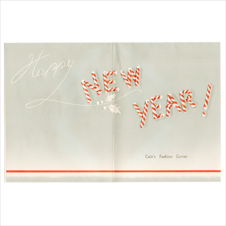 アンティークカードやヴィンテージカードなどの紙ものの中で人気の高いクリスマスカードです。こちらは1940年代のアメリカ製でショッピングモールなどにあるファッションコーナーが顧客などへアドバタイジング広告として配ったと推測されるグリーティングカードです。