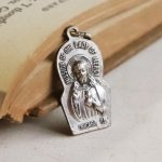 表面には聖母マリアが子供を優しく迎え入れる様子が施され、裏面には聖心や御心と呼ばれる心臓部分を指差すイエスキリストの像が施されています。