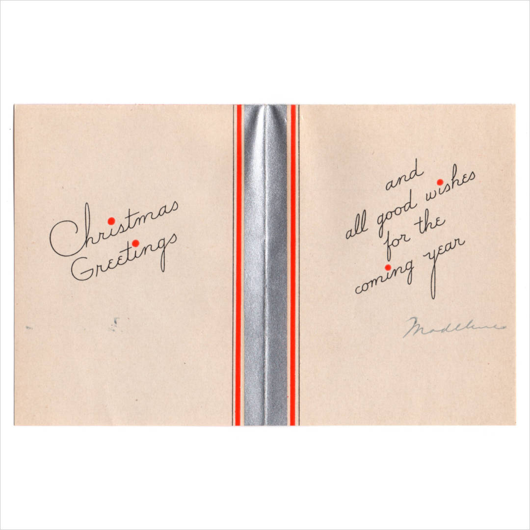 カードを開くと簡単なクリスマスグリーティング(挨拶)が印刷されています。また青いインクでうっすらと手書きのサインが記されています。