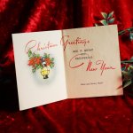 カードを開くと大変可愛らしい文字で、クリスマスと新年を祝うグリーティングメッセージと、ポインセチアとランタンが描かれています。