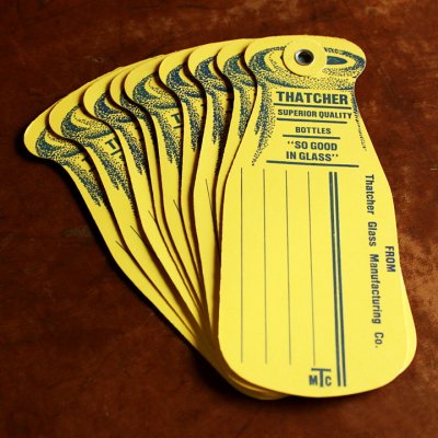 タグは鮮やかな黄色い型紙で出来ており、表面には紺色でThatcher Glass Manufacturing Co.と表記されています。