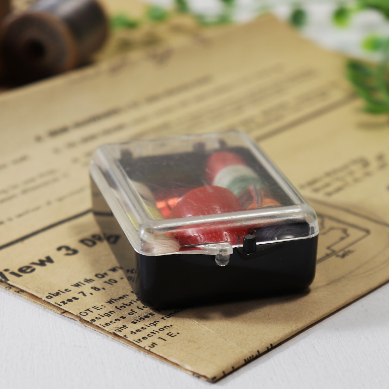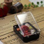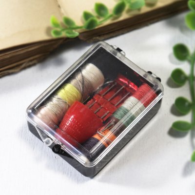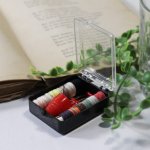 プラスティックケースの中には真っ赤な指ぬきや色とりどりの糸が巻かれた簡易スプール、糸通しや針が収納されています。