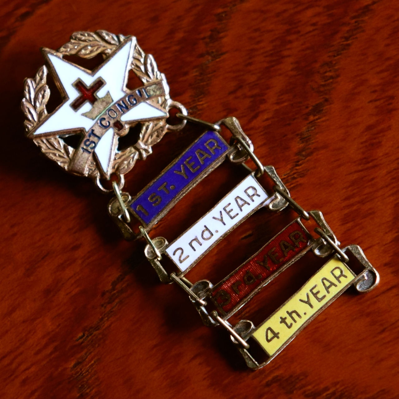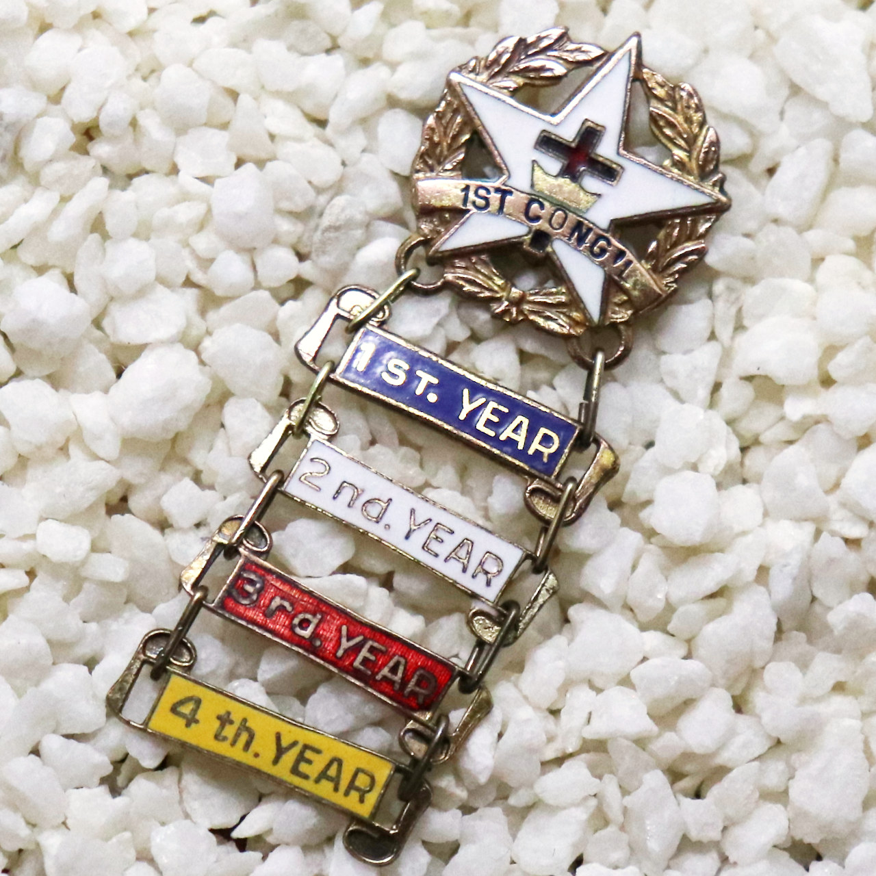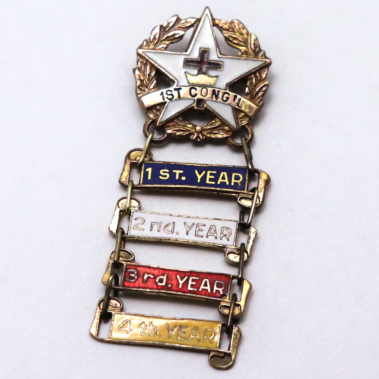 USAヴィンテージキリスト教日曜学校階級ブローチ1st CONG'L・4th YEARバッジ|サンデースクール・十字架ピンバッジ
