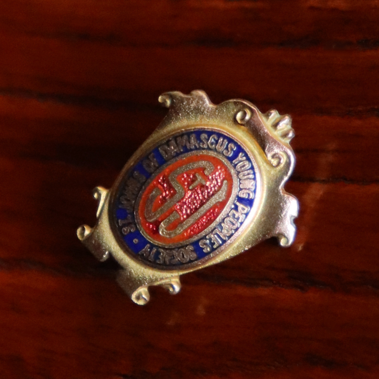 中央の赤いエナメルにはST. JOHNS(セントジョーンズ)を表すST Jの文字、それらを取り囲むようにブルーのエナメルにはカトリックや正教会で知られるST. JOHNS OF DAMASCUS YOUNG PEOPLES SOCIETY(ダマスカスの聖ヨハネ教会の若者達の協会)の文字が入っています。