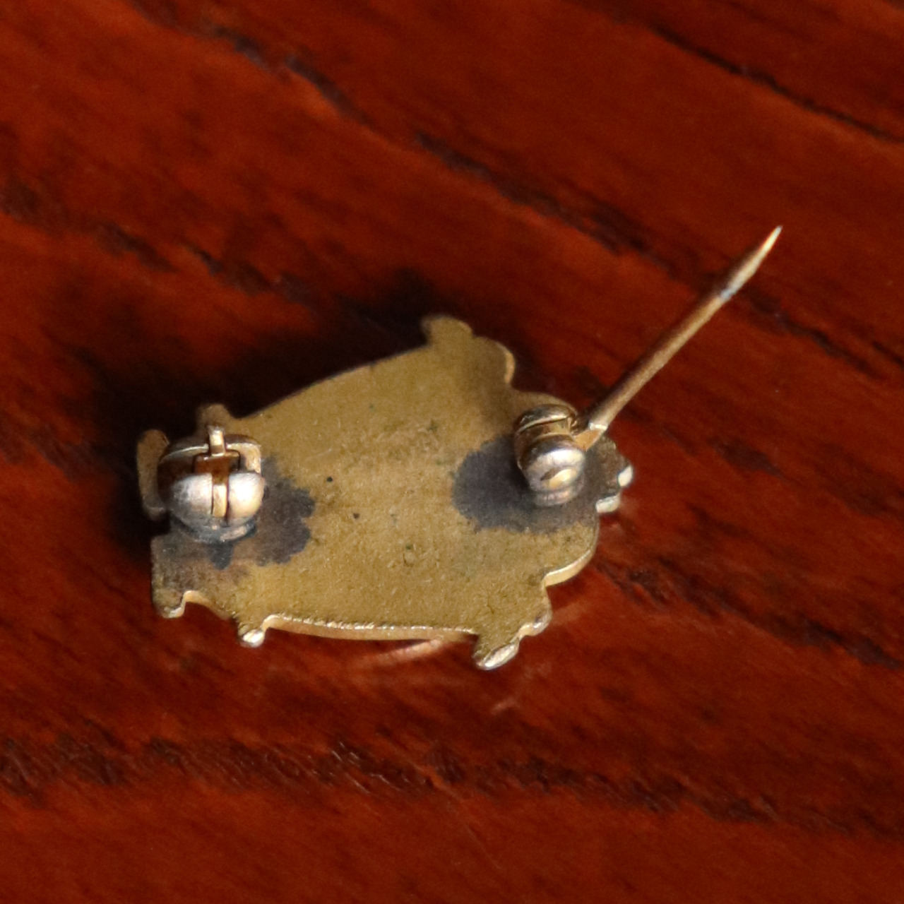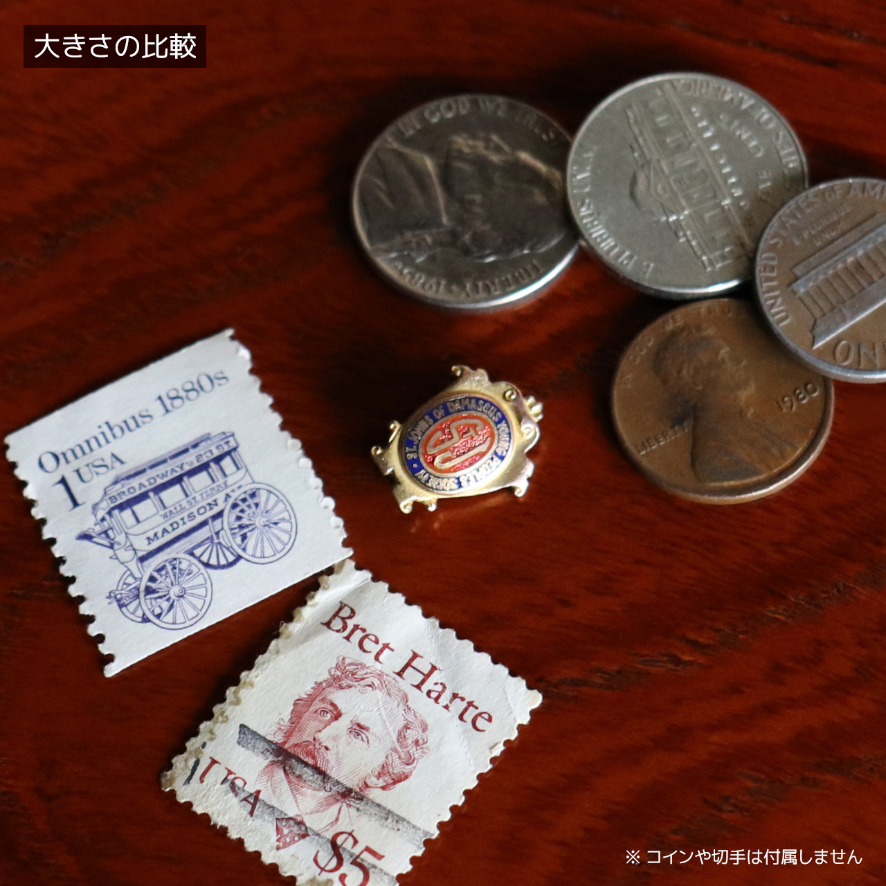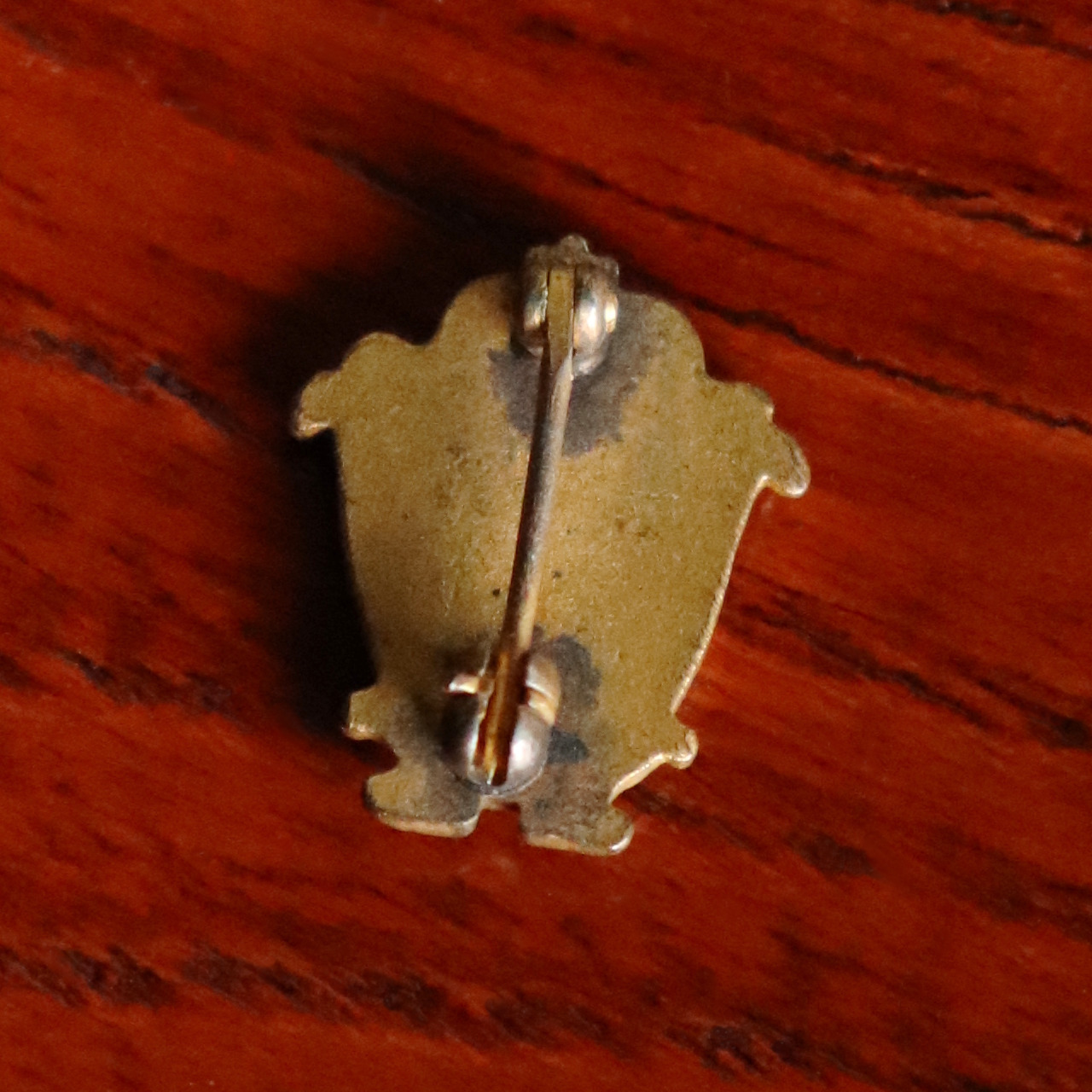 バッジはブローチになっており、ヴィクトリアン調の鏡のような形状に赤と青のエナメルが入っています。
